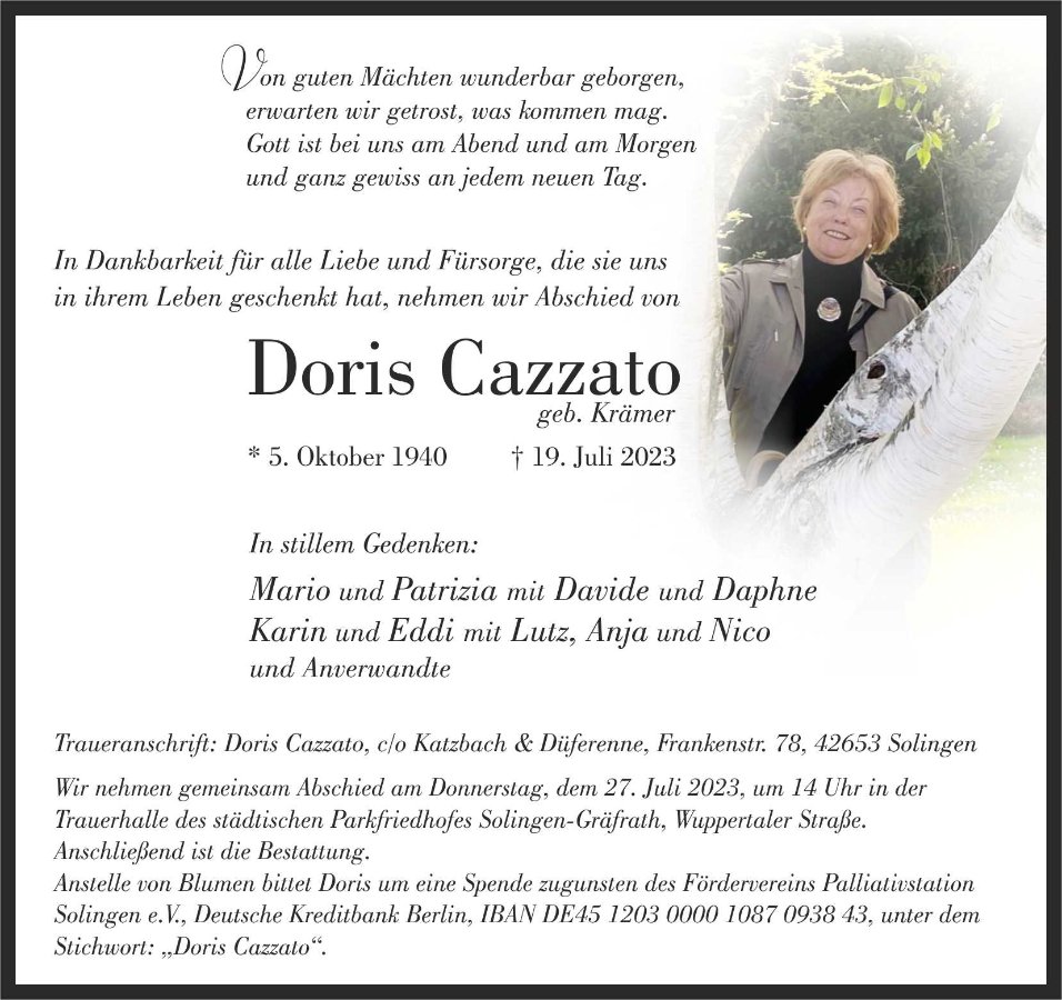 Mit großer Trauer haben wir verspätet vom Tode von Doris Cazzato erfahren. Vor unserem Urlaub rief sie noch bei uns an und teilte uns mit, dass sie tatsächlich Abschied nehmen möchte und ihr nicht mehr viel Zeit verbleiben würde. Wir waren tief betroffen und haben Doris Cazzato auch danach nicht mehr sprechen können. Viele viele Jahre war sie eine liebe, geschätzte und extrem freundliche Nachbarin, mit welcher wir sehr gerne gesprochen oder auch mal auf der Terasse gesessen haben. Sie hat unsere beiden Jungs von Anfang an aufwachsen sehen (der Älteste wird im Sept. nun 20) und immer mit Rat und Tat, freundlich begleitet. Die Beiden sind gerne "nach Nebenan" zu Ihr ins Wohnheim gegangen. Es waren ja auch nur ein paar Meter. Und wenn sie von Ihrem Balkon den Anschein hatte, dass bei uns was "nicht in Ordnung" ist, rief sie an um vorsichtshalber nachzufragen. Wir werden Doris Cazzato mit ihrer fröhlichen Art sehr vermissen. Sie war in ihrem Glauben fest verwurzelt und so sind wir fest davon überzeugt, dass sie mit offenen Armen von unserem Herren aufgenommen worden ist. Familie Dr. Judith & Roland Wölk mit Pascal und Marlon.